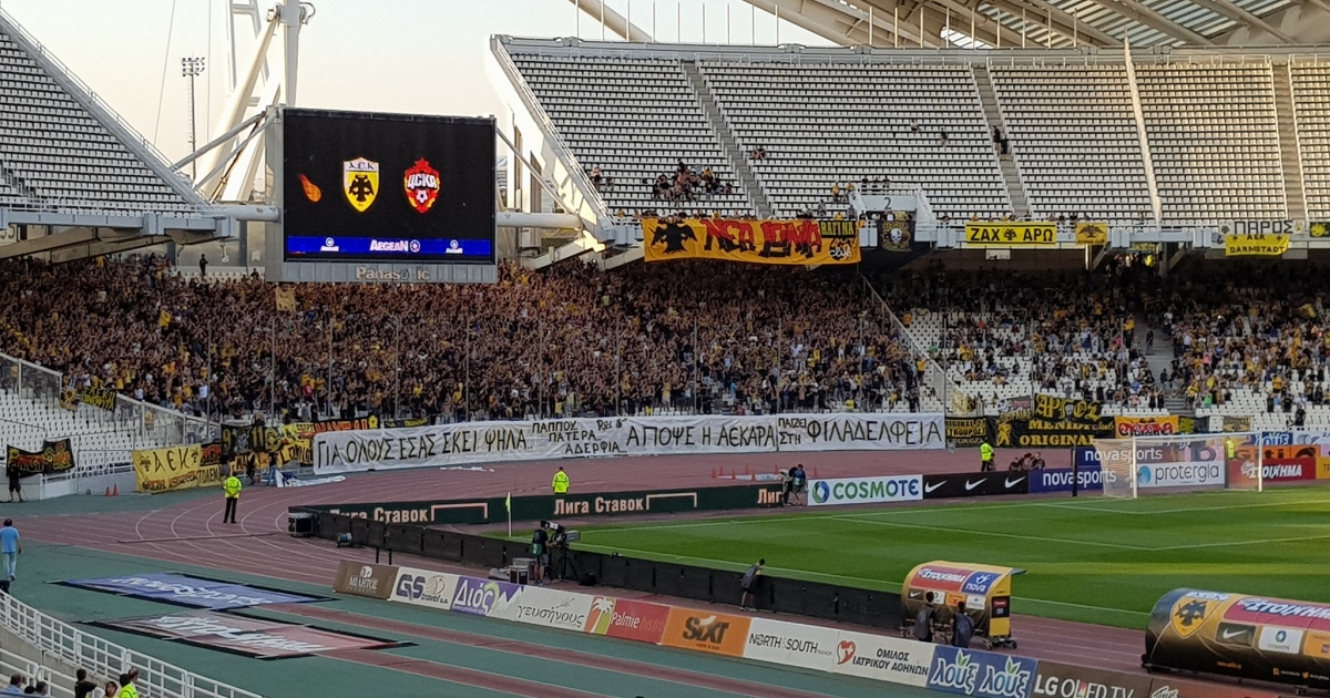 Στο πέταλο της Original 21, με την υπογραφή της αρκετή ώρα πριν από την σέντρα, ενδεικτικού και του ενθουσιασμού για τα καλά γηπεδικά νέα αναρτήθηκε πανί το οποίο έγραφε: «ΓΙΑ ΟΛΟΥΣ ΕΣΑΣ ΕΚΕΙ ΨΗΛΑ... ΠΑΠΠΟΥ, ΠΑΤΕΡΑ, ΑΔΕΡΦΙΑ, ΑΠΟΨΕ Η ΑΕΚΑΡΑ ΠΑΙΖΕΙ ΣΤΗ ΦΙΛΑΔΕΛΦΕΙΑ»! Γενικά το κλίμα ήταν πανηγυρικό, είχε έντονες αναφορές στο ιστορικό γήπεδο της Ένωσης κι αν μη τι άλλο το ματς αρχίζει με τους καλύτερους οιωνούς!