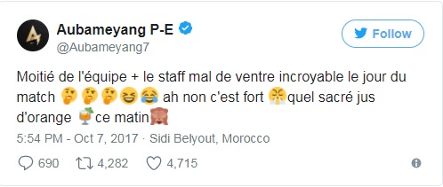 Ο φορ της Μπορούσια Ντόρτμουντ, μετά την ήττα με σκορ 3-0 και την απώλεια ενός εισιτηρίου για την τελική φάση του Παγκοσμίου Κυπέλλου της Ρωσίας, μάλλον εκπροσωπώντας κάθε μέλος της αποστολής της Γκαμπόν, έγραψε στα social media: