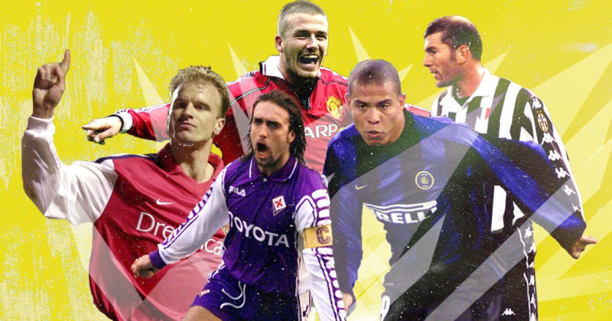 Μπατιστούτα να «πυροβολεί» με τις μακρυμάνικες μοβ εμφανίσεις της Φιορεντίνα. Μπέκαμ με απλωμένα χέρια μετά από γκολ-φάουλ με τις κατακόκκινες μακρυμάνικες της Γιουνάιτεντ. Ζιντάν να κοντρολάρει στον αέρα με την ασπρόμαυρη της Γιουβέντους.