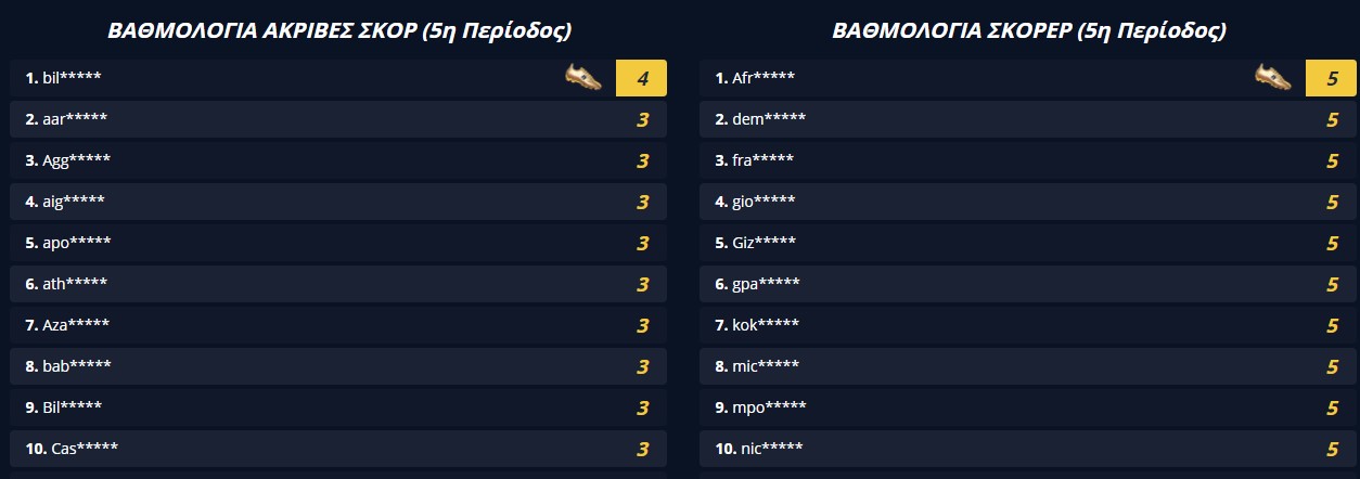 Στις βαθμολογίες τώρα, σε αυτή με το ακριβές σκορ, επιτέλους κάποιος ξεχώρισε φτάνοντας στις 4 σωστές προβλέψεις, ενώ σε αυτή με τους σκόρερ 16 έχουν 5 σωστές επιλογές.