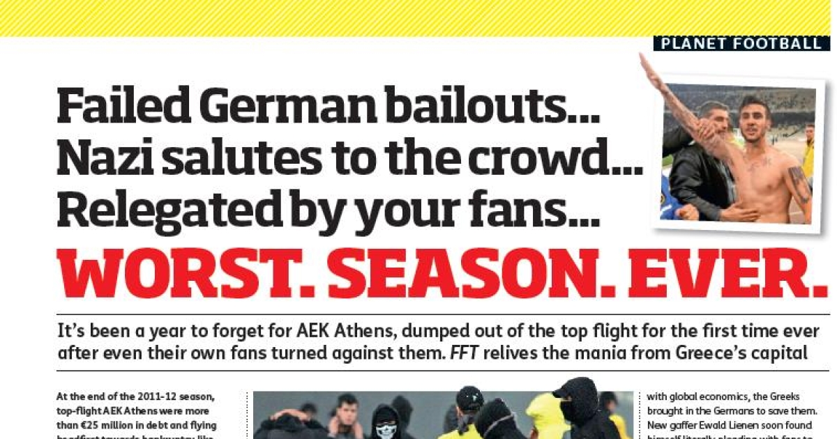 Στη διάρκεια του προηγούμενου μήνα είχα την πολύτιμη εμπειρία της συναναστροφής και συνεργασίας με την ομάδα Σύνταξης του FourFourTwo, ενός εκ των κορυφαίων και διασημότερων περιοδικών ποδοσφαίρου στον πλανήτη. Το αγγλικό περιοδικό, που κυκλοφορεί παγκοσμίως και έχει διαφορετικές εκδόσεις σε 15 χώρες, ενδιαφέρθηκε για την περιπέτεια της ΑΕΚ. Και μου ζήτησε ένα κείμενο που να διηγείται όσα της συνέβησαν της ΑΕΚ στην διάρκεια των τελευταίων περίπου 12 μηνών, για να εξηγήσει την κατάληξη της ιστορίας, δηλαδή τον υποβιβασμό της, ο οποίος δεν σόκαρε μόνο την ελληνική κοινωνία του ποδοσφαίρου, αλλά δημιούργησε αίσθηση και στην Ευρώπη.