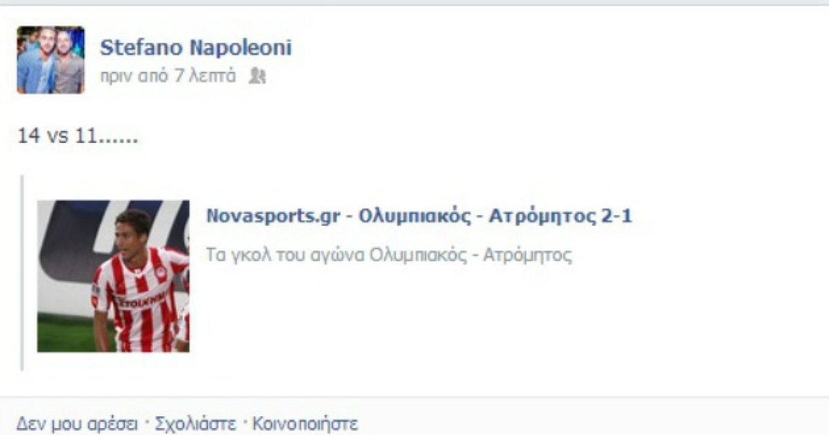 Ο Ιταλός επιθετικός, ο οποίος άνοιξε το σκορ στην αναμέτρηση, έγραψε στο status του στο facebook «14 vs 11» με το βίντεο της αναμέτρησης, αφήνοντας αιχμές για την διαιτησία του Ηλία Σπάθα και των βοηθών του.