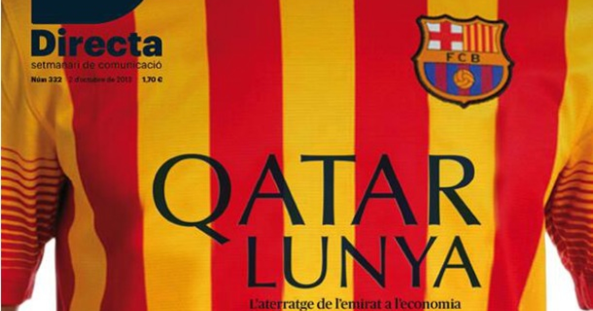 Με ένα πρωτοσέλιδο που ...τσακίζει κόκαλα κυκλοφορεί στα περίπτερα της Καταλονίας το γνωστό περιοδικό Directa. Eνα πρωτοσέλιδο που έρχεται να καυτηριάσει το γεγονός ότι η Μπαρτσελόνα έφτιαξε την δεύτερη εμφάνισή της στα χρώματα της σημαίας της Καταλονίας με ό,τι αυτό συνεπάγεται και από την άλλη επιτρέπει -λόγω χορηγού- την "προσγείωση" ενός Εμιράτου στην καταλανική οικονομία, αγνοώντας τις συνεχείς καταπατήσεις των ανθρωπίνων δικαιωμάτων στον Περσικό Κόλπο!
