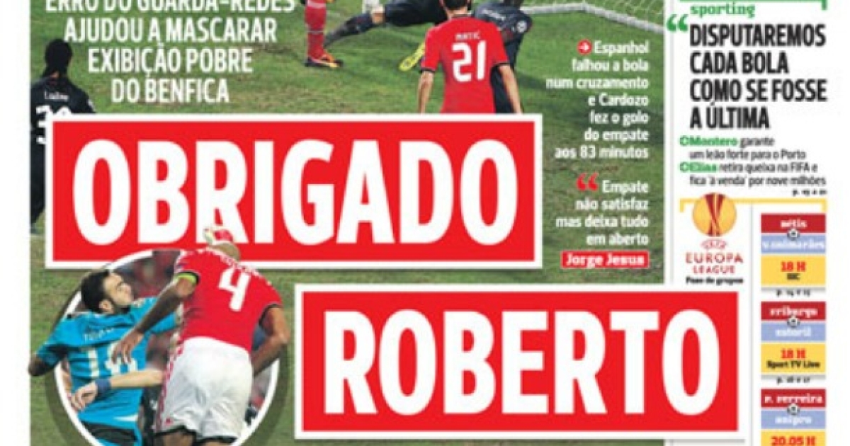 «Σε ευχαριστούμε, Ρομπέρτο», είναι ο τίτλος της πορτογαλικής εφημερίδας και στο πρωτοσέλιδα αναφέρει: «Το λάθος του τερματοφύλακα βοήθησε να καλύψει την κακή εμφάνιση της Μπενφίκα. Η κακή έξοδος του Ισπανού έδωσε την δυνατότητα να ισοφαρίσει ο Καρντόσο στο 83’».