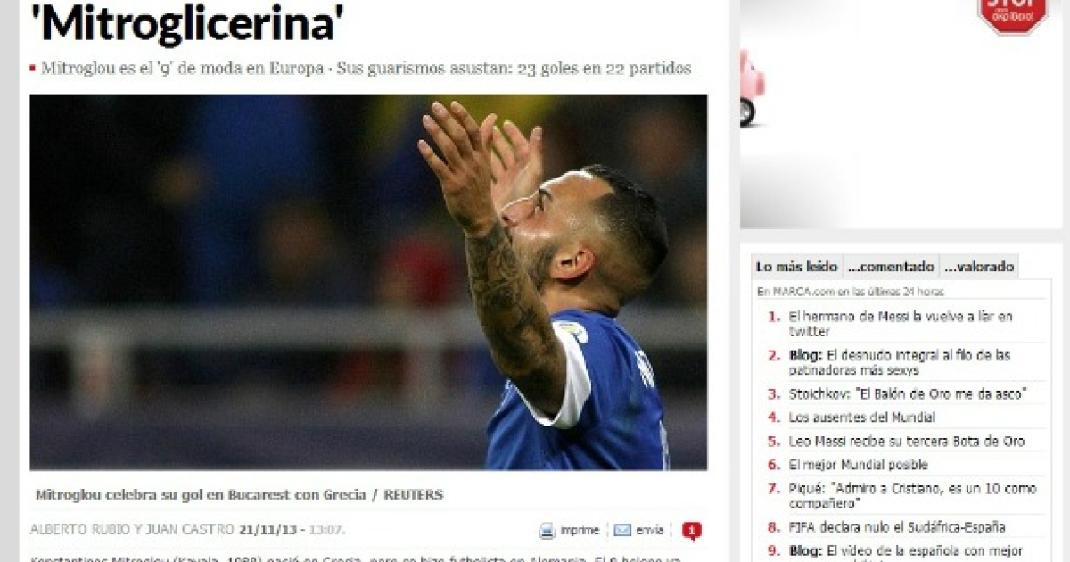Ο επιθετικός του Ολυμπιακού και της Εθνικής Ομάδας απασχολεί την ισπανική εφημερίδα με τις επιδόσεις του, οι οποίες όπως τονίζει τρομάζουν. Η «Marca» κάνει μια αναδρομή στην καριέρα του 25χρονου επιθετικού επισημαίνοντας ότι «οι αριθμοί του (23 γκολ σε 22 ματς) είναι στο ύψος μόνο του Κριστιάνο Ρονάλντο».