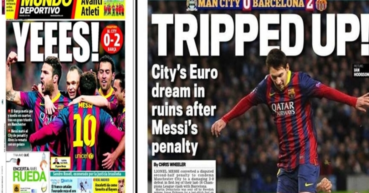 Η καταλανική El Mundo υποδέχθηκε την ήττα των Μπαλουγράνα στα... αγγλικά! Ένα τεράστιο «Υeees!» με του καταλανού να πανηγυρίζουν βρίσκεται στο πρωτοσέλιδό της! «Οι Καταλανοί απόλαυσαν ένα 2-0 επί της Σίτι με γκολ του Μέσι και του Άλβες, φέρνοντας το σύλλογο με το ενάμιση πόδι στα προημιτελικά». Η Marca γράφει: «Η Μπάρτσα έβγαλε νοκ άουτ τη Σίτι και προσθέτει: «Οι μπλαουγράνα πέτυχαν έναν μεγαλοπρεπή θρίαμβο που πρακτικά τους φέρνει στους "8".».