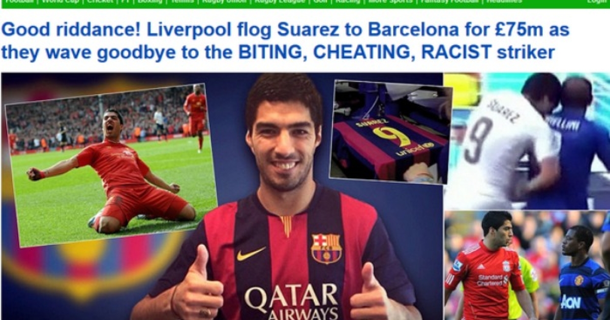 «Στα τσακίδια! Η Λίβερπουλ ξεπούλησε τον Σουάρες στη Μπαρτσελόνα με 81 εκατομμύρια ευρώ και αποχαιρέτησε τον ποδοσφαιριστή που δαγκώνει, κλέβει και κάνει ρατιστικές επιθέσεις» είναι ο εκπληκτικός τίτλος στην ιστοσελίδα της Daily Mail, για τη μετακίνηση του Ουρουγουανού επιθετικού στην ομάδα της Βαρκελώνης.