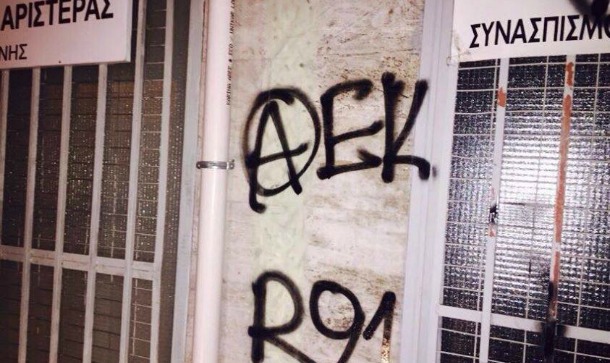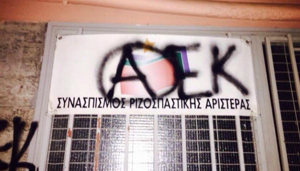 Όπως μπορείτε να διαπιστώσετε και στις φωτογραφίες που δημοσιεύει το gazzetta.gr, μετά την απαγόρευση παρουσίας "κιτρινόμαυρων" οπαδών στην ομιλία Τσίπρα στην Κομοτηνή από την αστυνομία με εντολή του ΣΥΡΙΖΑ, αλλά και τις ατάκες της Δούρου που φέρεται να αποκάλεσε χρυσαυγίτες τους Ενωσίτες (κάτι που σιχαίνονται και πολεμούν οι ΑΕΚτσήδες) οι τελευταίοι επισκέφτηκαν τοπικές οργανώσεις της Αθήνας και έγραψαν συνθήματα.