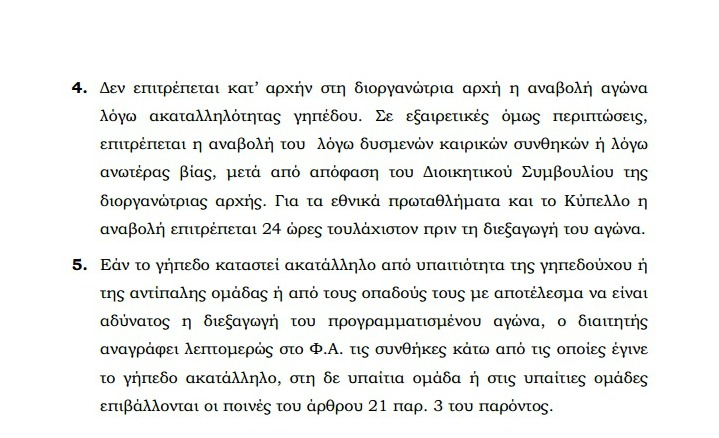 Εκτός των άλλων σύμφωνα με το άρθρο 21 του ΚΑΠ όταν υπάρχουν σφοδρές πιθανότητες να μην γίνει ένα ματς την επόμενη ημέρα τότε αυτό αναβάλλεται επ' αόριστον. Ειδικότερα το άρθρο 21 παρ.1α του ΚΑΠ αναφέρει: «Κατ' εξαίρεση, το αρμόδιο καταστατικό όργανο της διοργανώτριας δύναται να αποφασίσει την μη τέλεση του αγώνα την επόμενη ημέρα εφόσον κρίνει ότι πιθανολογείται σφόδρα η μη δυνατότητα τέλεσής του». Επίσης σύμφωνα με την έκθεση των υπευθύνων της Λίγκας για το γήπεδο δεν επρόκειτο να ήταν σε θέση να φιλοξενήσει παιχνίδι ούτε την Κυριακή αλλά ούτε και τις επόμενες ημέρες. Σε ότι αφορά βέβαια τον Ολυμπιακό εκτός από την ταλαιπωρία με ένα άσκοπο ταξίδι (σ.σ. καθώς ματς δεν έγινε) πλέον μπερδεύτεται το πρόγραμμα της ομάδας.