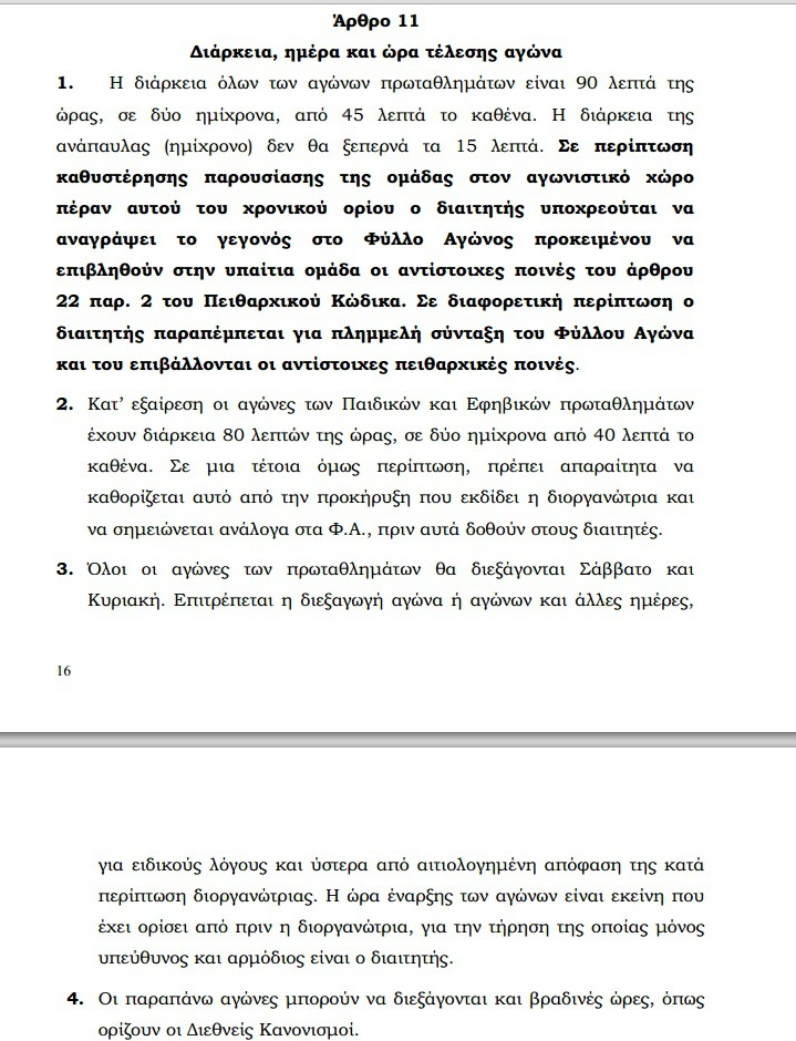 Το άρθρο 11 για διάρκεια, ημέρα και τέλεση αγώνα