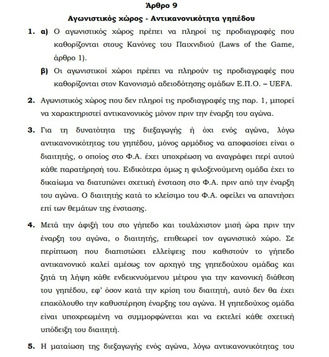 Τι λέει το άρθρο 9 για αγωνιστικούς χώρους και αντικανονικότητα γηπέδου