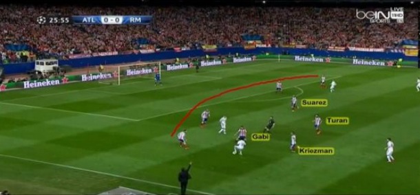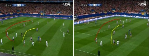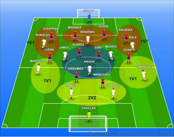Επίσης ο Carvajal ήταν αυτός που αμυντικά έκλεινε προς τα μέσα και πλαισίωνε τους 2 κεντρικούς αμυντικούς για να βοηθάει στην δημιουργία μίας σχέσης 3v2 vs Mantzukic και Griezman, μιας και όπως είπαμε ο Marcelo ήταν προσαρμοσμένος στον Turan. Οι 3 μεσαίοι + τον Bale προσαρμοζότανε στους Suarez, Gabi και Koke δημιουργώντας μία κατάσταση 4v3, και όταν ανέβαινε ο Juafran στο μαρκάρισμα του έπεφτε ο James με άμεση μετατόπιση των άλλων τριών.