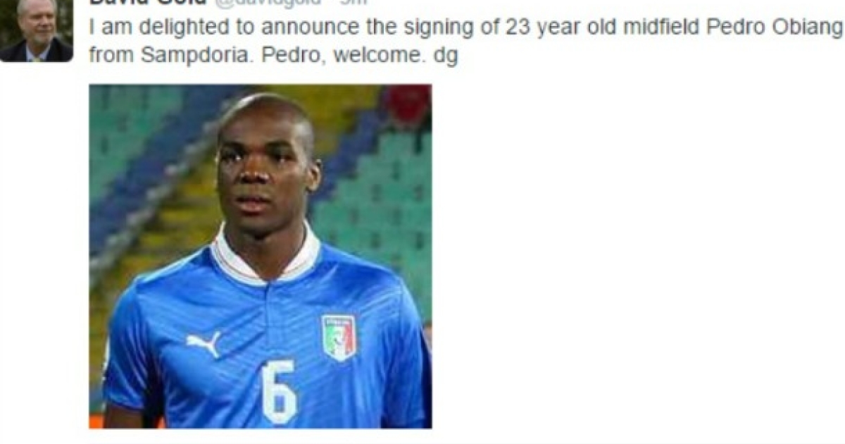 Οι Hammers απέκτησαν τον χαφ της Σαμπντόρια, Πέδρο Ομπιάνγκ, με τον πρόεδρο να πέφτει σε τρελή γκάφα αφού ανακοίνωσε και καλωσόρισε τον Αντζελο Ογκμπόνα της Γιουβέντους βάζοντας την φωτογραφία του.