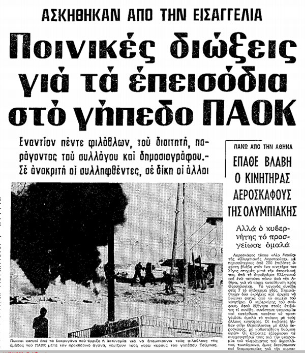 Τα πρωτοφανή για την εποχή επεισόδια στο γήπεδο, αλλά και σε ολόκληρη την περιοχή της Τούμπας, από τη Λαμπράκη μέχρι και την 25η Μαρτίου, είχαν απολογισμό: 23 αστυνομικοί τραυματίες, 20 φίλαθλοι τραυματίες και 7 συλλήψεις.