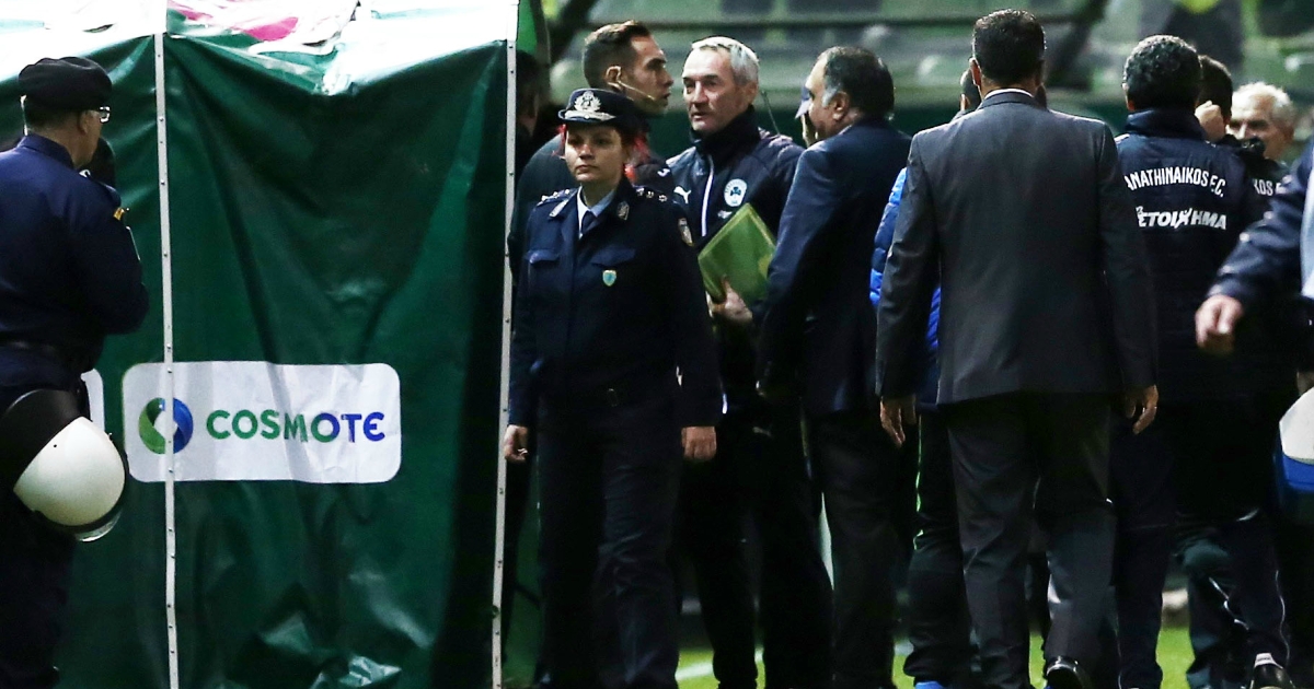 Στο δρόμο για τα αποδυτήρια, ο 42χρονος προπονητής πλησίασε τον Τάσο Αθηναίου για να εκφράσει τις ενστάσεις του αρκετά έντονα και ο Αθηναίος διαιτητής του απάντησε: «Τον εκνευρισμό σας και τα νεύρα σας να μην τα βγάζετε σε μας τους διαιτητές. Δείτε τι γίνεται έξω (για τις αποδοκιμασίες του κόσμου). Καληνύχτα σας».