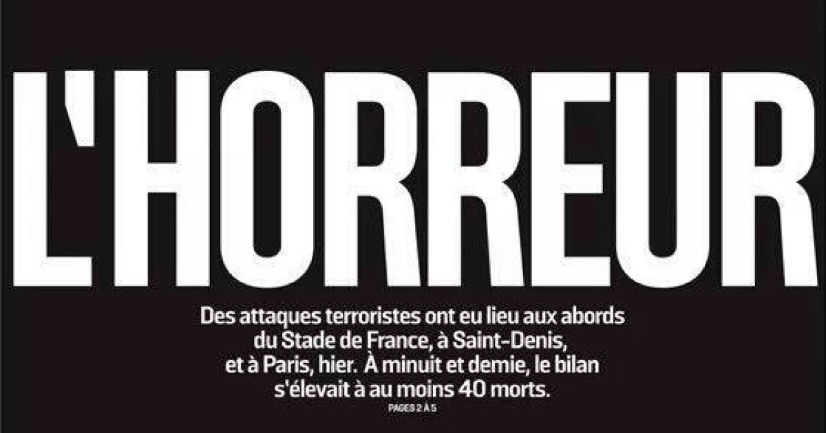 «Ο τρόμος. Τρομοκρατικές επιθέσεις κοντά στο Stade de France, στο Σαν Ντενί και στο Παρίσι χθες. Στις δώδεκα και μισή, ήταν τουλάχιστον 40 νεκροί» γράφει το πρωτοσέλιδο της γαλλικής εφημερίδας.