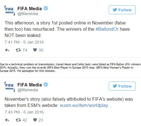 Ποιος θα πάρει τη Χρυσή Μπάλα για το 2015; Ο Λιονελ Μέσι! Αυτό αποκάλυψε και η... FIFA, αφού αναρτήθηκε για λίγο στην ιστοσελίδα της φωτογραφία που τονίζει πως ο Αργεντίνος σταρ θα είναι ο φετινός νικητής, ενώ την ίδια διάκριση στις γυναίκες θα έχει η Γερμανίδα Τσέλια Σάσιτς. Λίγο αργότερα προσπάθησε να σώσει την κατάσταση τονίζοντας: «Το απόγευμα μια ιστορία, που δημοσιεύτηκε πρώτη φορά τον Νοέμβριο ( ήταν και τότε αναληθής), βγήκε ξανά στην επιφάνεια. Οι νικητές της Χρυσής Μπάλας δεν έχουν διαρρεύσει» και προσθέτει: «Η ιστορία του Νοεμβρίου (επίσης χρεώθηκε λανθασμένα στην FIFA) είχε παρθεί από την ιστοσελίδα του ESM. Εξαιτίας ενός τεχνικού προβλήματος, ο Λιονέλ Μέσι και η Σίλια Σάσιτς ανακηρύχθηκαν οι νικητές της Χρυσής Μπάλας για το 2015. Ειδικότερα, πήραν τα βραβεία αντιστοίχως για τον καλύτερο παίκτη και την καλύτερη παίκτρια της Ευρώπης για το 2015. Ζητούμε συγγνώμη για το λάθος».