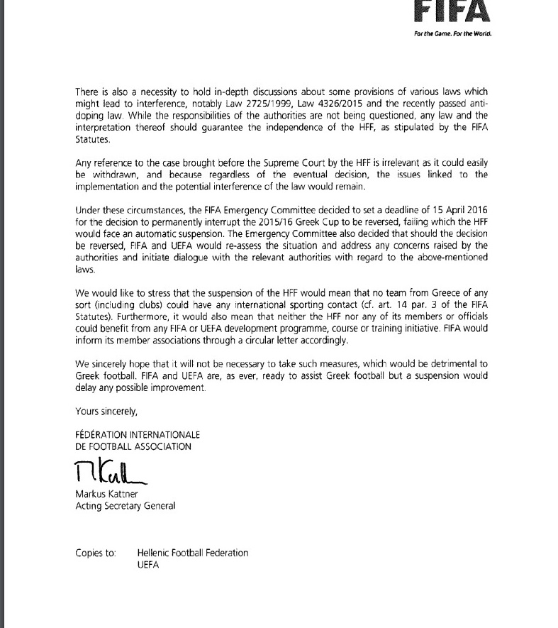 Όπως αναφερόταν στην επιστολή μας με ημερομηνία 21 Μαρτίου 2016, η FIFA και η UEFA σας κάλεσαν να αναθεωρήσετε την απόφασή σας να διακόψετε οριστικά τη διοργάνωση του ποδοσφαιρικού Κυπέλλου Ελλάδας 2015/2016, διαφορετικά θα εξέταζαν την υπόθεση για επιβολή κυρώσεων. Δυστυχώς, τέτοια δέσμευση δεν εξασφαλίστηκε είτε κατά τη διάρκεια της συνάντησης είτε έως την 1η Απριλίου 2016, προθεσμία που τέθηκε στην επιστολή μας της 21ης Μαρτίου 2016, και ως εκ τούτου η υπόθεση παραπέμφθηκε στην Επιτροπή Εκτάκτων Θεμάτων της FIFA.