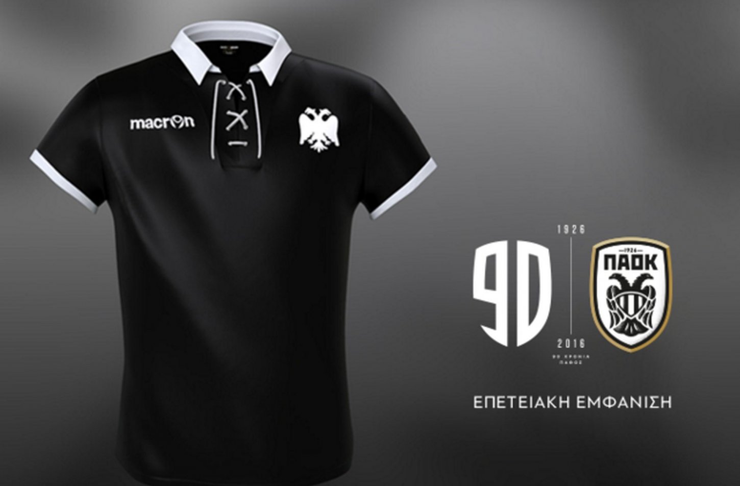 Εμπνευσμένη από τις χρυσές εποχές του ΠΑΟΚ, η επετειακή φανέλα αποτελεί αντίγραφο της φανέλας του 1966. Στα χαρακτηριστικά της φανέλας συγκαταλέγονται ο λευκός, μεγάλος γιακάς, τα χοντρά κορδόνια στο στήθος, ο ιδιαίτερος Δικέφαλος Αετός και το λογότυπο των 90 χρόνων στο μανίκι. Τυπωμένο στην ετικέτα βρίσκεται και το πρώτο σήμα στην ιστορία του ΠΑΟΚ, το πέταλο με το τετράφυλλο τριφύλλι που εμπνεύστηκε ο εκ των ιδρυτών του συλλόγου Κώστας Κοεμτζόπουλος.