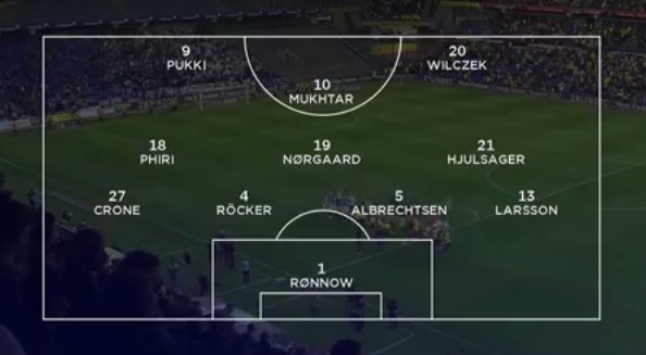 Ο Ρόνοου ήταν κάτω από τα δοκάρια. Στο κέντρο της άμυνας ο 36χρονος Άλμπρετσεν με τον Ρέκερ. Δεξί μπακ ο Λάρσον και αριστερό ο Κρόνε. Στην τριάδα της μεσαίας γραμμής κεντρικό χαφ ήταν ο Νόργκαρντ, όπου πλαισιωνόταν από τον Χουλσάγκερ και τον Φίρι δεξιά και αριστερά αλλά στην ίδια ευθεία. Ο Μουκτάρ σε ρόλο επιτελικού μέσου και στην κορυφή της επίθεσης ο Πούκι με τον Βίλτσεκ.