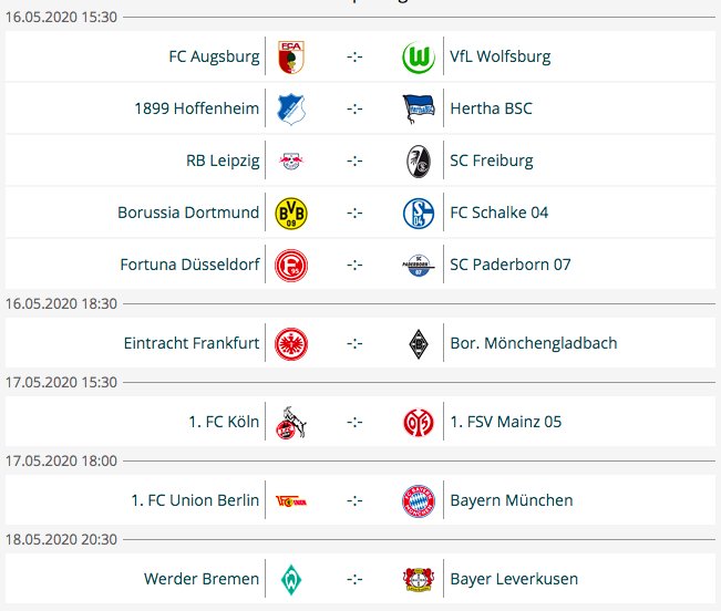 Η αγωνιστική θα ξεκινήσει από το Σάββατο 16 Μαΐου με το ματς της Ντόρτμουντ κόντρα στην Σάλκε, καθώς δεν θα πραγματοποιηθεί το παιχνίδι της Παρασκευής (15/05) και θα ολοκληρωθεί την Δευτέρα με τον αγώνα Βέρντερ-Λεβερκούζεν.