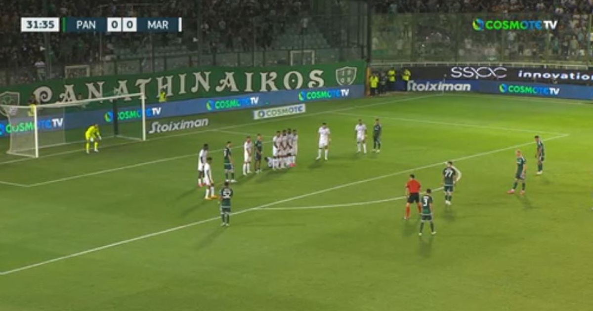 Στο 32' ο Παναθηναϊκός κέρδισε φάουλ σε εξαιρετική θέση. Ο Μάγκνουσον το ανέλαβε με το αριστερό, αλλά δεν μπόρεσε να περάσει την μπάλα από το τείχος των παικτών της Μαρσέιγ.
