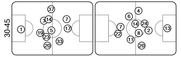 Ποιο ήταν το πρώτο προπονητικό τρικ του Μαξ Αλέγκρι; Οτι ΔΕΝ έπαιξε ούτε λεπτό το συγκεκριμένο σύστημα η Γιουβέντους! Κι όμως οι γηπεδούχοι μεταμορφώνονταν μέσα στο γήπεδο και πολύ σημαντικό ρόλο σε αυτό αρχικά έπαιξε ο Εμρε Τσαν. Οπως βλέπετε στα δύο σχεδιαγράμματα της UEFA στα δύο πρώτα τέταρτα του αγώνα (0-15, 15-30) η Γιουβέντους παίζει 3-4-3.
