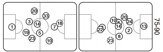 Οσο για την τακτική του Σιμεόνε; Οπως θα δείτε στα σχεδιαγράμματα πιο πάνω δεν άλλαξε στιγμή το 4-4-2 στο πρώτο ημίχρονο, πείραξε την ομάδα του στο τέταρτο 60-75 προσπαθώντας να βάλει περισσότερους παίκτες στον άξονα (κι εκεί ο Αλέγκρι το γύρισε 3-3-1-3) και στο τέλος είχε ένα άναρχο 3-4-3 όπως βλέπετε στο σχεδιάγραμμα του 75-90...