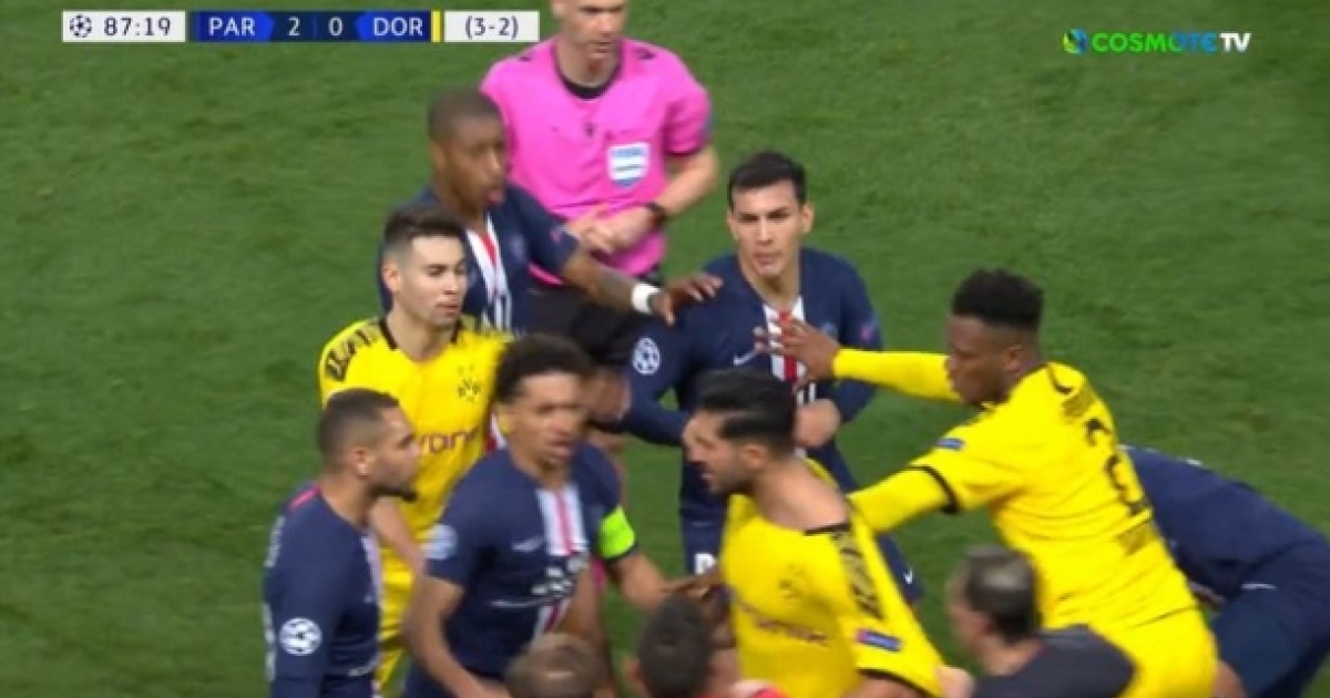 Μαρκίνιος, Ντι Μαρία και Κουρζαβά αναμείχθηκαν για τους Παριζιάνους, με τον μέσο της Ντόρτμουντ να παίρνει τον δρόμο προς τα αποδυτήρια αφού ηρέμησαν τα πνεύματα.