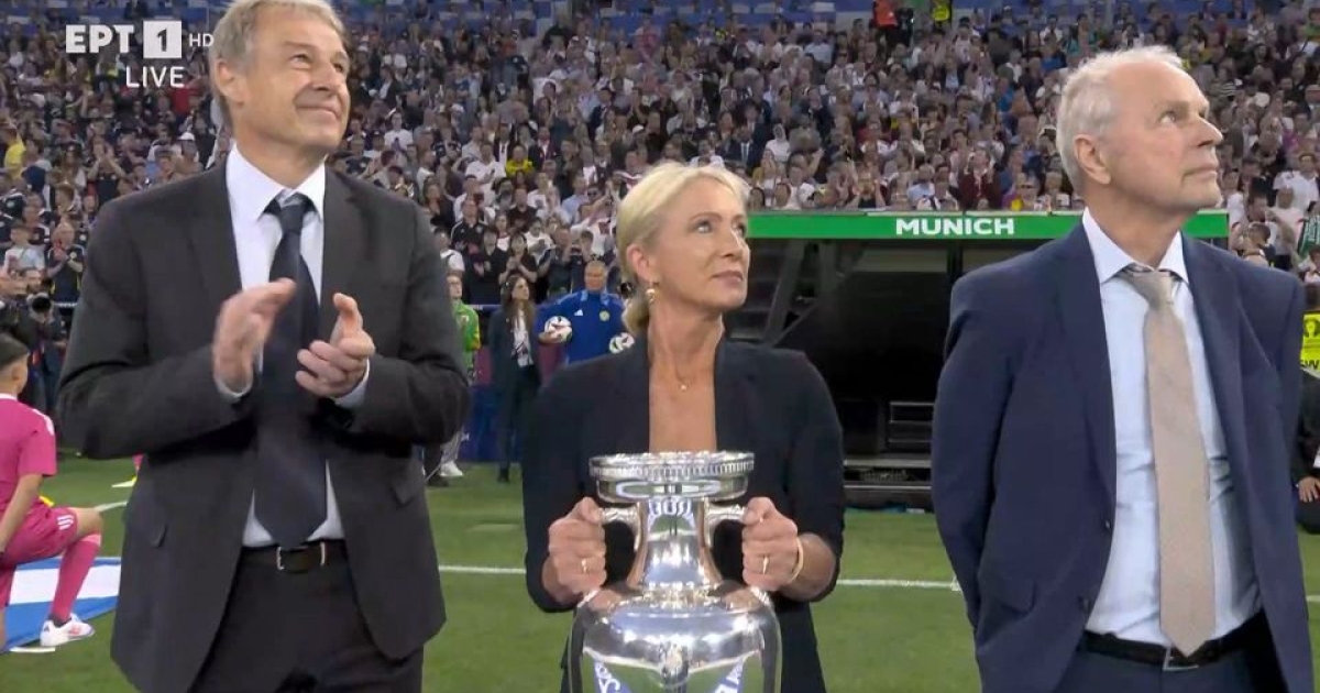 Ανατριχίλα στην «Allianz Arena», με τη σύζυγο του θρυλικού Φραντς Μπεκενμπάουερ, Χάιντι, να βγάζει το τρόπαιο του EURO 2024 στον αγωνιστικό χώρο σε μια συγκλονιστική στιγμή.