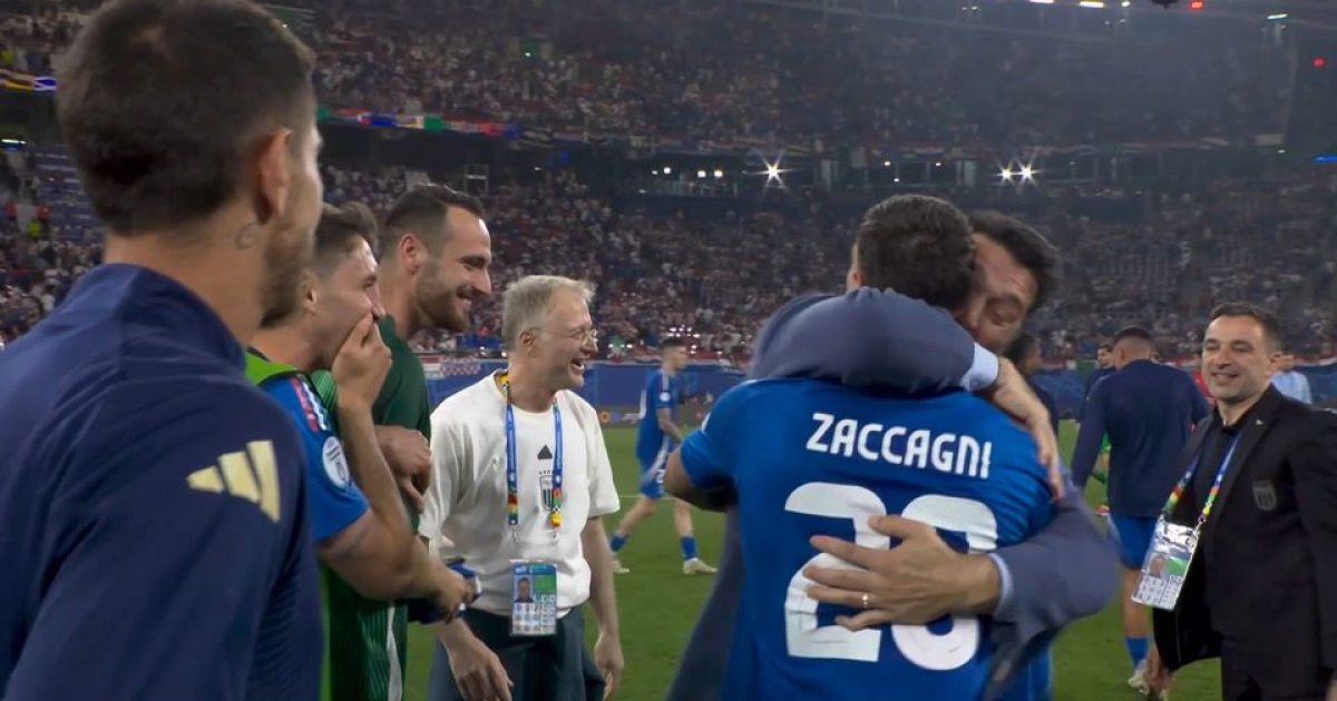 Σε... πελάγη ευτυχίας ο θρύλος του ιταλικού ποδοσφαίρου, Τζανλουίτζι Μπουφόν, που έτρεξε να αγκαλιάσει τον Τζακάνι μετά το «χρυσό» γκολ που πέτυχε στα τελευταία δευτερόλεπτα της αναμέτρησης ανάμεσα στην Ιταλία και την Κροατία.