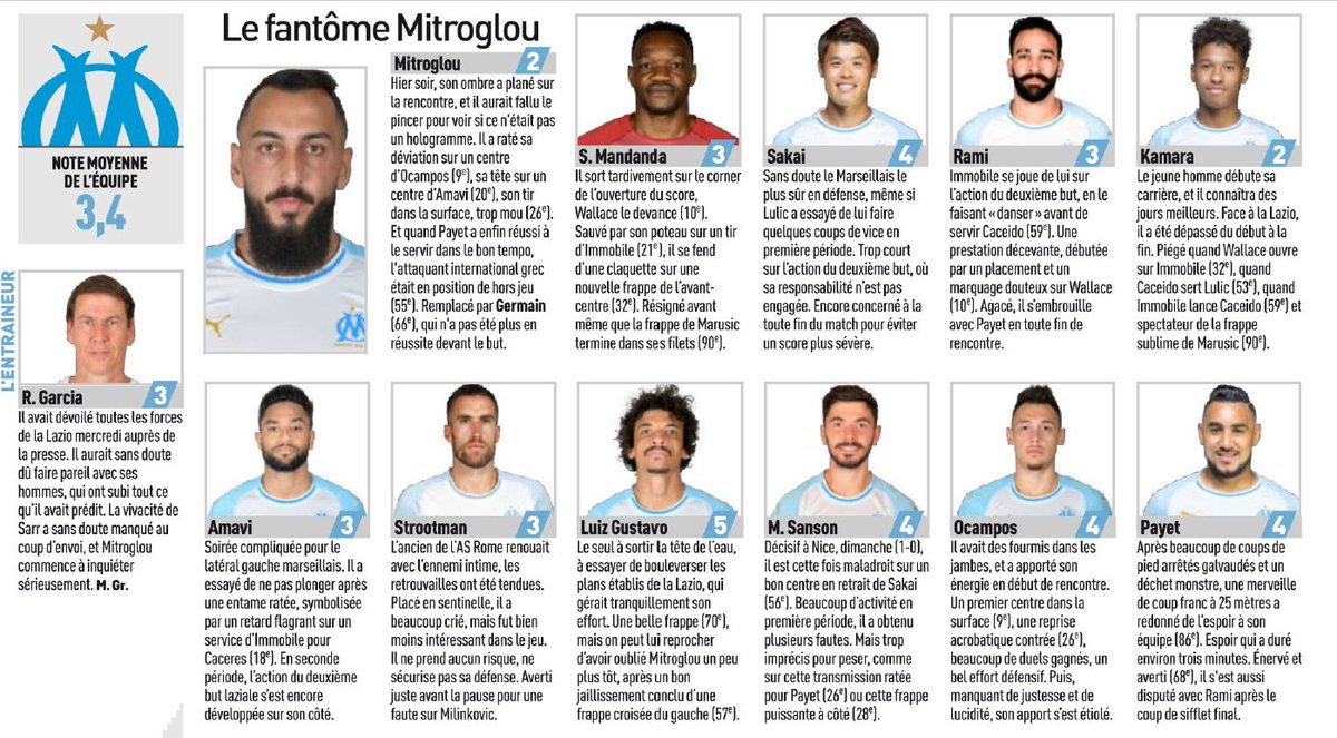 Μαζί με τον Καμαρά, ο Κώστας Μήτρογλου πήρε τον χειρότερο βαθμό στην κριτική της Equipe για την εμφάνιση των παικτών της Μαρσέιγ στην εντός έδρας με σκορ 3-1 από τη Λάτσιο.