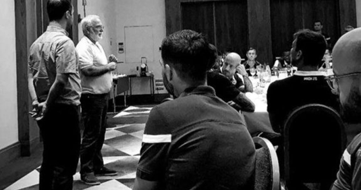 Ο γιος του, Γιώργης, ανέβασε στον προσωπικό λογαριασμό του στο Instagram ένα στιγμιότυπο από την σημερινή συνάντηση κατά τη διάρκεια της οποίας ο ισχυρός άνδρας των νταμπλούχων Ελλάδας επισήμανε την σημασία της αναμέτρησης με την Σλόβαν και επιχείρησε να «ντοπάρει» ψυχολογικά τους ποδοσφαιριστές και τον Αμπέλ Φερέιρα.