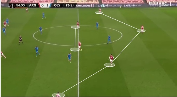 Αρκετά προβλήματα στη αμυντική μετάβαση του Ολυμπιακού σχεδόν αποκλειστικά σε open play καταστάσεις. Η Arsenal έβρισκε αρκετούς χώρους στα μεσοδιαστήματα καθώς ο Ολυμπιακός έπαιζε ανοιχτά προσπαθώντας να επιτεθεί από τις πλευρές. Στην παρακάτω φάση αποτυπώνονται οι αποστάσεις των δύο κεντρικών χαφ και οι υποαριθμίες για τον Ολυμπιακό που δημιουργούνται σε πρώτο χρόνο.
