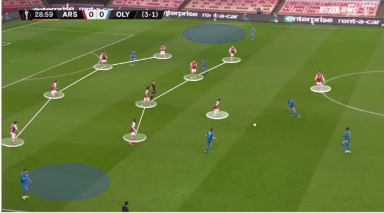 Η Arsenal προσπάθησε να κλείσει πολύ καλά τους χώρους και να μην επιτρέψει στον Ολυμπιακό να διεισδύσει από τον άξονα, σε σχηματισμό 1-4-4-1-1 με τους Elneny και Xhaka να είναι η δυάδα στην μεσαία γραμμή και τον Ceballos ναι παίζει λίγο πιο μπροστά τους δημιουργώντας έναν συμπαγή άξονα και δίνοντας επιλογή στον Ολυμπιακό να βρει χώρους από τα πλάγια πραγματοποιώντας αρκετές σέντρες με πολύ μικρή αποτελεσματικότητα 2/18 σέντρες με μόλις 11% ευστοχία.