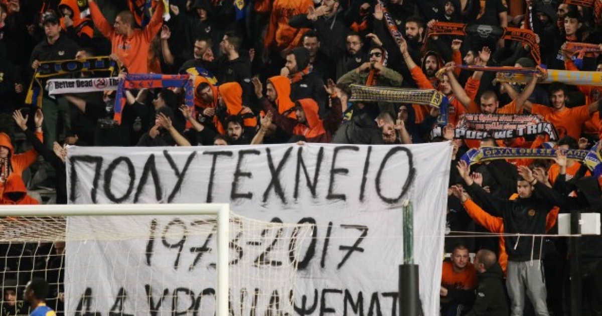 Στο ντέρμπι της Κύπρου κόντρα στην Ομόνοια, όπου το ΑΠΟΕΛ επικράτησε με 3-1, οι οπαδοί των νικητών φρόντισαν να προκαλέσουν με το πανό που σήκωσαν και το οποίο έγραφε: «ΠΟΛΥΤΕΧΝΕΙΟ. 1973-2017. 44 ΧΡΟΝΙΑ ΨΕΜΑΤΑ». Το θετικό είναι ότι δεν ζούμε πια στην εποχή που νοσταλγεί η μερίδα οπαδών που σήκωσε αυτό το πανί κι έτσι ακόμη κι αυτοί έχουν το δικαίωμα να εκφράζονται ελεύθερα.