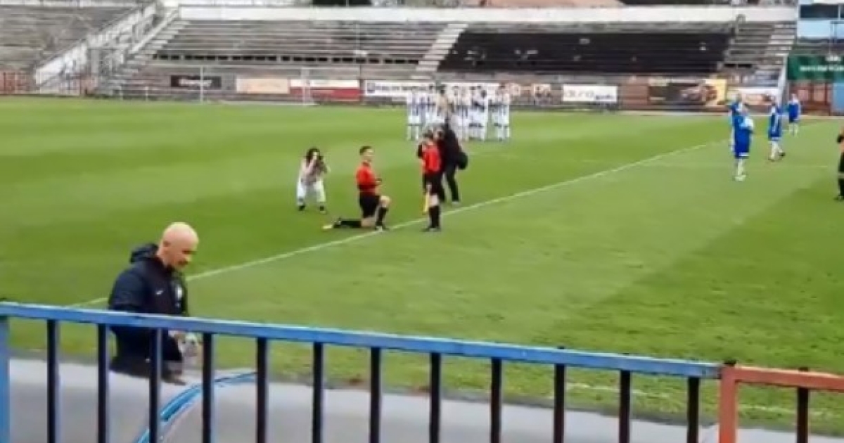 Ισως η πιο γλυκιά στιγμή στα γήπεδα της Ρουμανίας τη σεζόν που διανύουμε. Η σέντρα του ματς άργησε λίγα λεπτά, αυτή τη φορά για καλό σκοπό! Ο ένας επόπτης κατέβασε τη σημαία, σήκωσε το δαχτυλίδι και ζήτησε σε γάμο τη βοηθό διαιτητή που ήταν στην άλλη πλευρά του γηπέδου. Ευτυχώς για τον επόπτη η απάντηση ήταν θετική και το ματς άρχισε κανονικά!