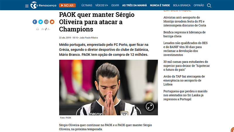 Ο αθλητικός διευθυντής της ΠΑΕ ΠΑΟΚ φιλοξενήθηκε το βράδυ της Δευτέρας (22/4) στο Radio Renascenca και την εκπομπή «Bola Branca», όπου μίλησε και για το θέμα της παραμονής του Σέρζιο Ολιβέιρα, μετά το τέλος του δανεισμού του από την Πόρτο.
