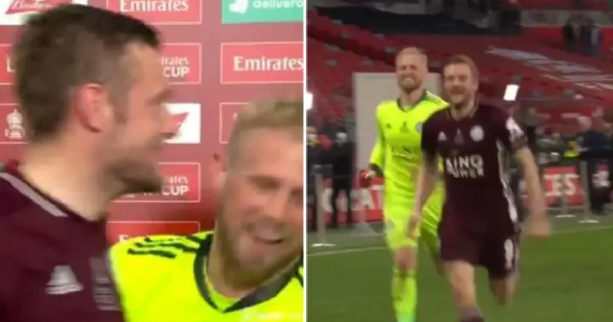 Kasper Schmeichel cut @TheDesKelly short so that Jamie Vardy could join in the celebrations #EmiratesFACupFinal pic.twitter.com/yQhfJW5MvD