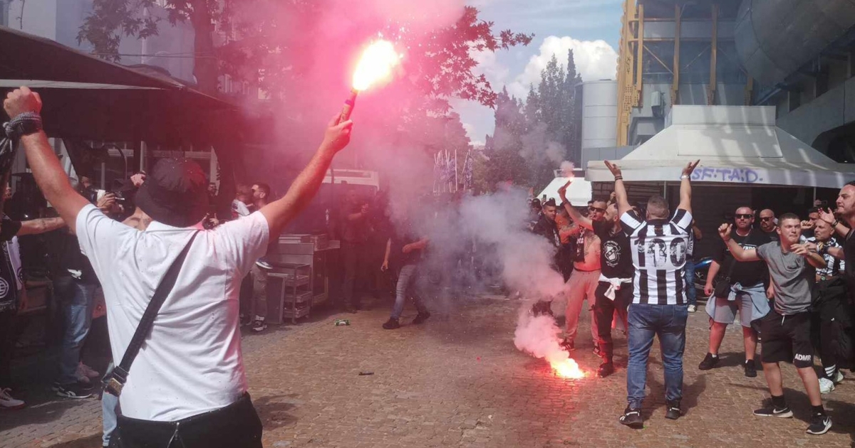 Οι φίλοι των Κρητικών έχουν δημιουργήσει μια γιορτινή ατμόσφαιρα στον χώρο δίπλα από τον σταθμό του Ηλεκτρικού στο Μαρούσι με καπνογόνα και συνθήματα.
