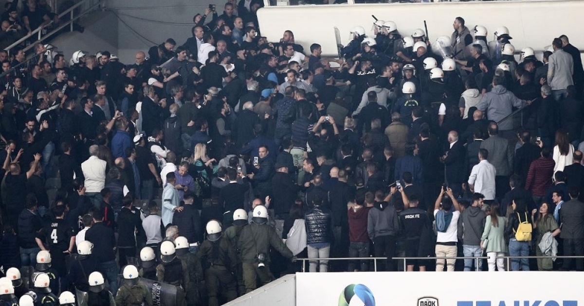 Πίσω από τις κεντρικές θέσεις των επισήμων, σε κοινό χώρο των δύο χώρων με τους αντιπάλους φιλάθλους, βρίσκονταν όρθιοι περίπου 100 άνθρωποι εκ των οποίων, πλην των αστυνομικών, οι υπόλοιποι ήσαν ανάμεικτοί φίλαθλοι των ομάδων και άλλοι των οποίων ο ρόλος δεν ήταν γνωστός. Η κατάσταση αυτή εγκυμονούσε πολλούς κινδύνους.