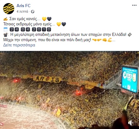 Πριν από ακριβώς δέκα χρόνια, στις 24 Απριλίου 2010, περίπου 30.000 φίλοι του Άρη βρέθηκαν στις κερκίδες του Ολυμπιακού Σταδίου της Αθήνας και στον τελικό του Κυπέλλου Ελλάδας όπου οι «πράσινοι» επικράτησαν με 1-0. Στο μήνυμά της, η ΠΑΕ Άρης έγραψε… «Σαν εμάς κανείς. Τέτοιες εκδρομές μόνο εμείς. Η μεγαλύτερη οπαδική μετακίνηση όλων των εποχών στην Ελλάδα! Μέχρι την επόμενη, που θα είναι και πάλι δική μας!».