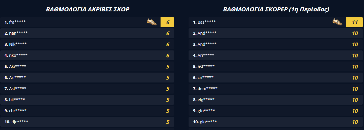 Στην βαθμολογία με το ακριβές σκορ είχαμε αλλαγή στην κορυφή, αφού πλέον συγκατοικούν 4 άτομα στην 1η θέση με 6 σωστές προβλέψεις (χθες είχαμε 2 στην κορυφή), ενώ στους σκόρερ μόνο ένας έχει 11 σωστές επιλογές και έχει πάρει την ελάχιστη διαφορά από τους διώκτες του.