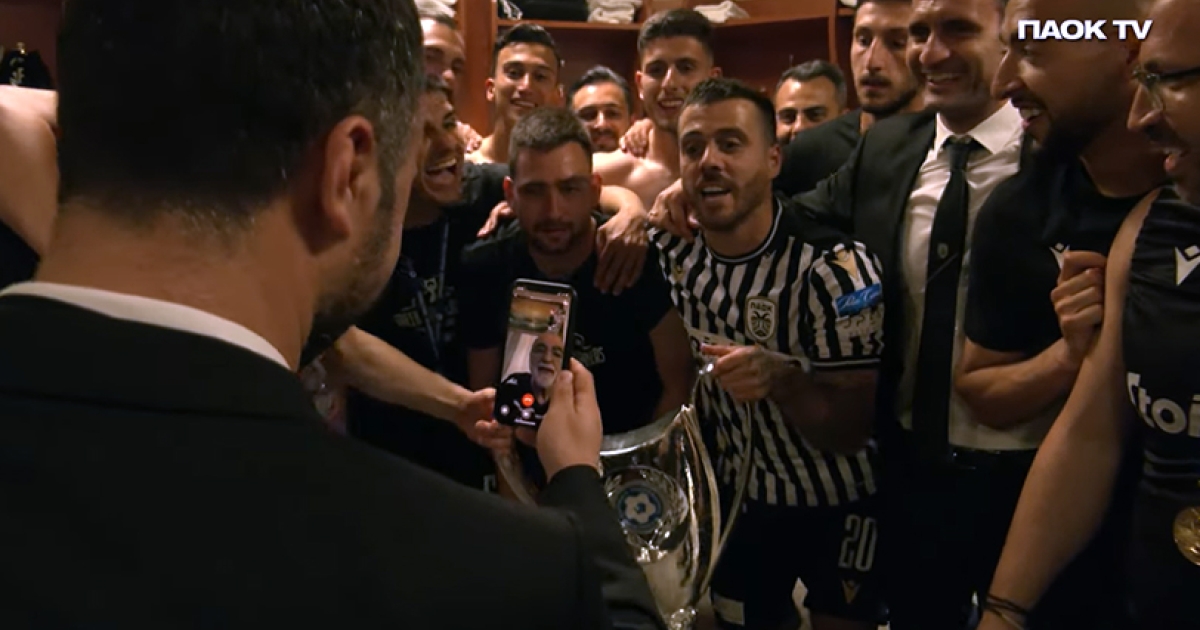 Οι ποδοσφαιριστές του ΠΑΟΚ γλέντησαν με τραγούδια και συνθήματα την κατάκτηση του 8ου κυπέλλου στην Ιστορία του Συλλόγου και το αφιέρωσαν στον ιδιοκτήτη της ομάδας, Ιβάν Σαββίδης, ο οποίος μέσω βιντεοκλήσης επικοινώνησε μαζί τους γιορτάζοντας, έστω κι από μακριά, μαζί τους την πέμπτη κούπα που κατακτά ο «Δικέφαλος» επί των ημερών του.