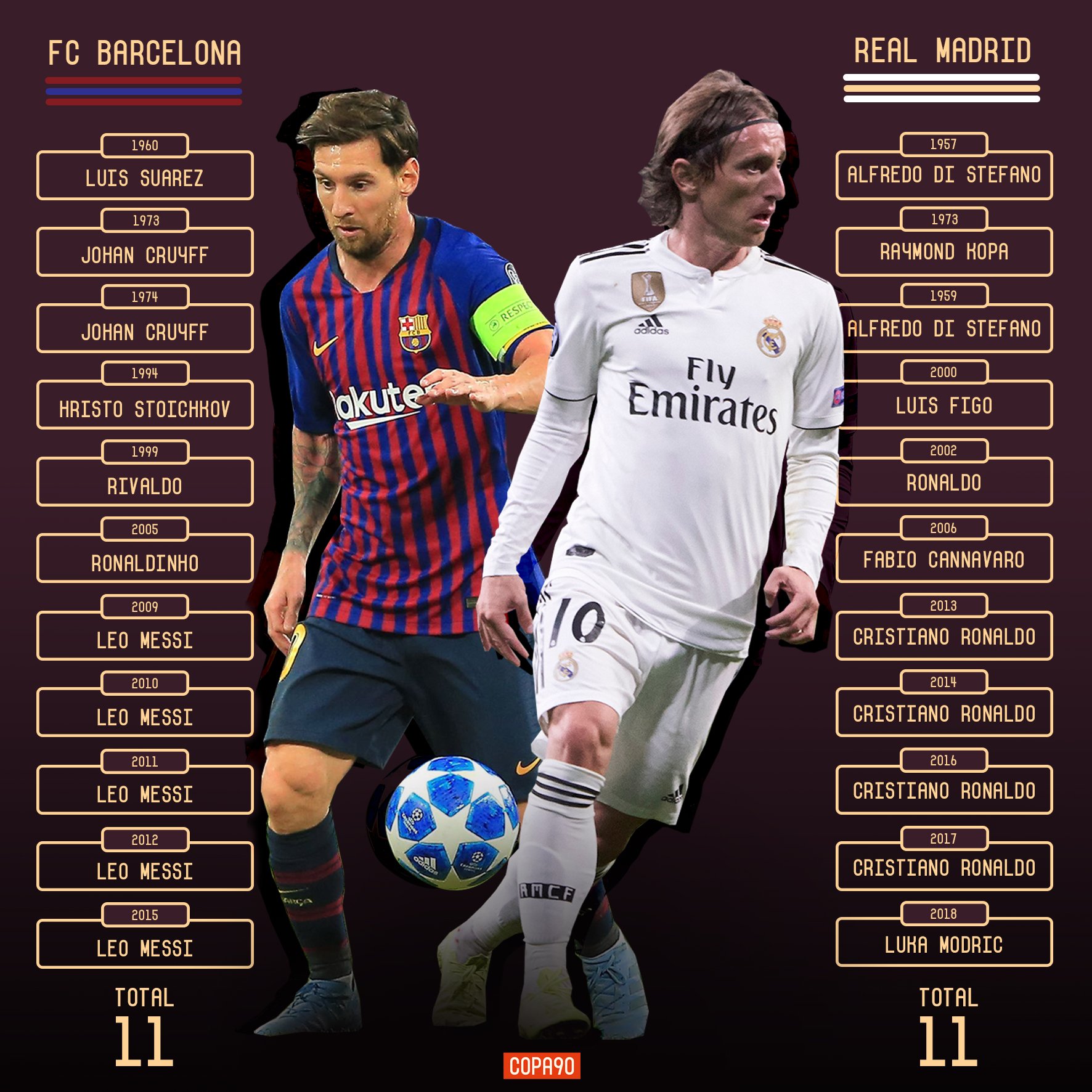 Αντίθετα, η Μπαρτσελόνα βρίσκεται πλέον... στο -1 στις κατακτήσει σε μια άτυπη κόντρα με τη «βασίλισσα», με τον παλαίμαχο Ισπανό μεσοεπιθετικό, Λουίς Σουάρες, να κάνει την αρχή το 1960, ν' ακολουθεί δις ο Κρόιφ (1973 και 1974), έπειτα ο μεγάλος Χρίστο Στόιτσκοφ (1994), ο Ριβάλντο (1999), ο Ροναλντίνιο (2005) και οι πέντε φορές του Λιονέλ Μέσι (2009, 2010, 2011, 2012, 2015).