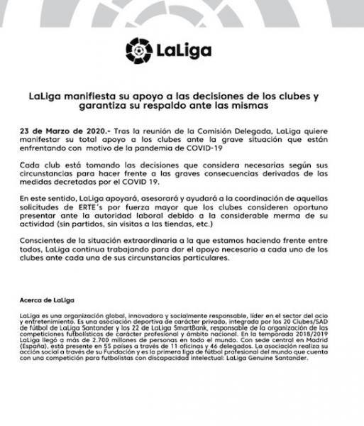 Στην πληγείσα Ισπανία, η Λίγκα εξέφρασε την πλήρη στήριξη της στους συλλόγους που θα προχωρήσουν σε αυτά τα μέτρα και θα έχει συμβουλευτικό ρόλο ώστε να το αντιμετωπίσουν με τον πιο αποτελεσματικό δυνατό τρόπο.