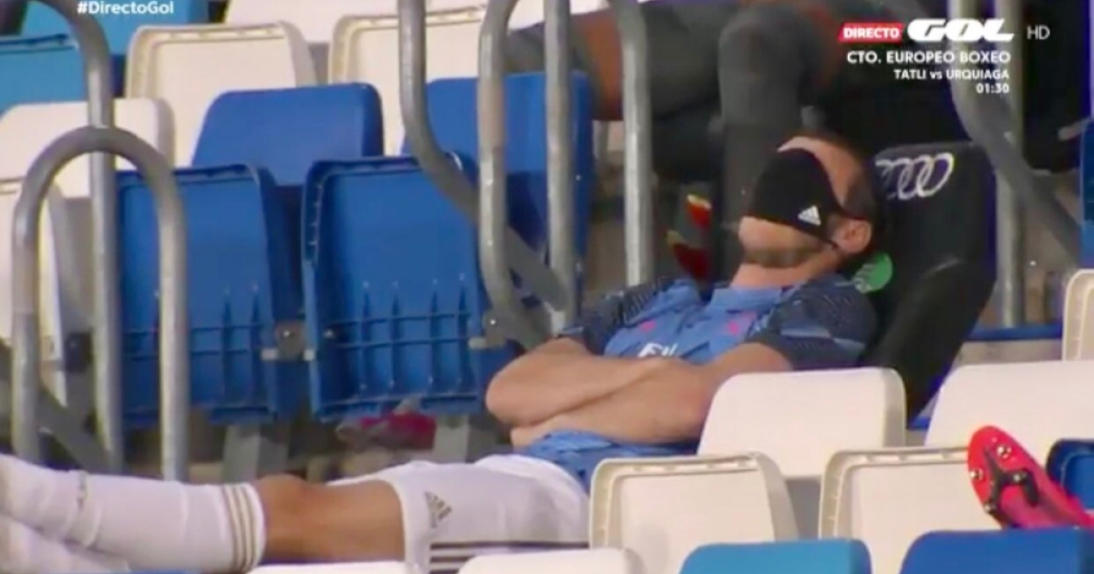 Ετσι, ο Γκάρεθ Μπέιλ αποφάσισε να... ξεκουραστεί λιγάκι καθώς όπως φάνηκε, βαριόταν απίστευτα. Αφού τέντωσε τα πόδια, σταύρωσε τα χέρια του και κάλυψε με την μάσκα το πρόσωπο του, αφέθηκε αμέριμνος για λίγα δευτερόλεπτα στην αγκαλιά του Μορφέα.