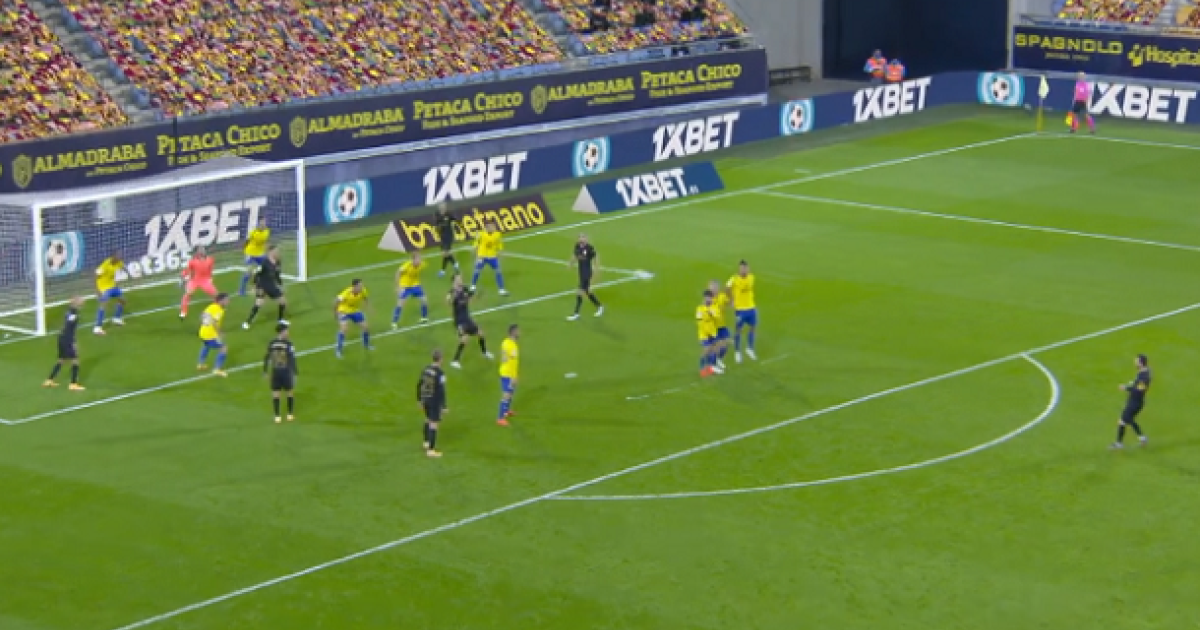 Δείτε λοιπόν τη διάταξη της Κάντιθ στο φάουλ που ήταν έτοιμος να εκτελέσει ο Λιονέλ Μέσι: τρεις παίκτες στο τείχος, ένας στα τέσσερα μέτρα για να «κόψει» πιθανή πάσα του Αργεντινού, τέσσερις πίσω από το τείχος παραταγμένοι και... έτοιμοι για όλα, δύο κοντά στα κάθετα δοκάρια και ο... τερματοφύλακας.