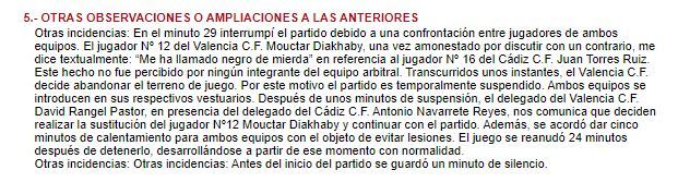 Η Κάντιθ επικράτησε με 2-1 της Βαλένθια, ωστόσο το ματς σημαδεύτηκε από το επεισόδιο του Χουάν Καλά με τον Μουκτάρ Ντιακαμπί στο 30ο λεπτό, το οποίο είχε ως συνέπεια οι «νυχτερίδες» να αποχωρήσουν προσωρινά από τον αγωνιστικό χώρο, καταγγέλλοντας ότι ο Γάλλος αμυντικός δέχθηκε ρατσιστική επίθεση!