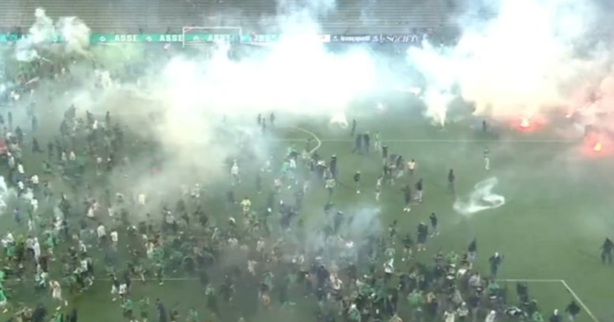 Saint Etienne relegated to Ligue 2 and the place immediately turns into a Warzone, complete and utter chaos as both sets of players get attacked. 😳 pic.twitter.com/MKFZwU9oNy